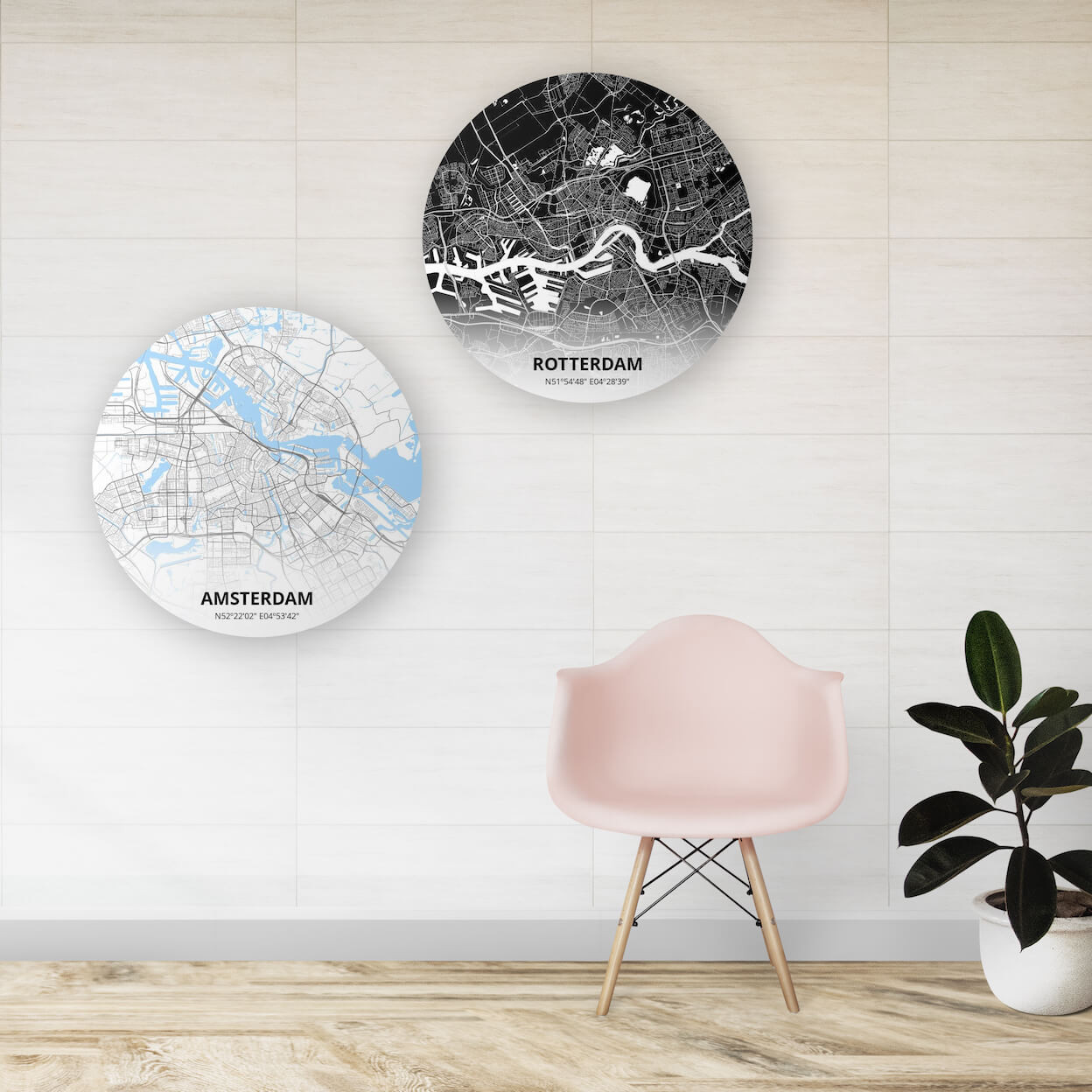 De ronde vorm maakt een opmars! Deze hippe vorm staat in contrast met de strakke moderne en industriële woonstijl. Als je naar interieur inspiratie op Pinterest of Instagram kijkt, zie je dat overal cirkels zijn. Daarom vanaf nu ook te bestellen bij Printmijnstad!